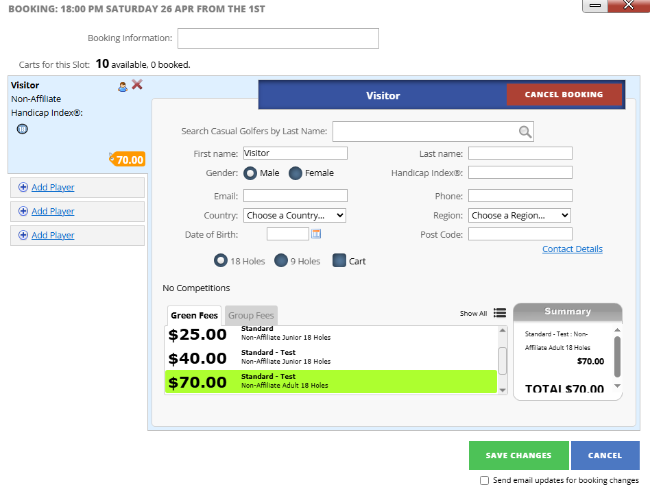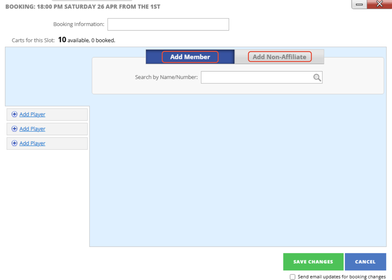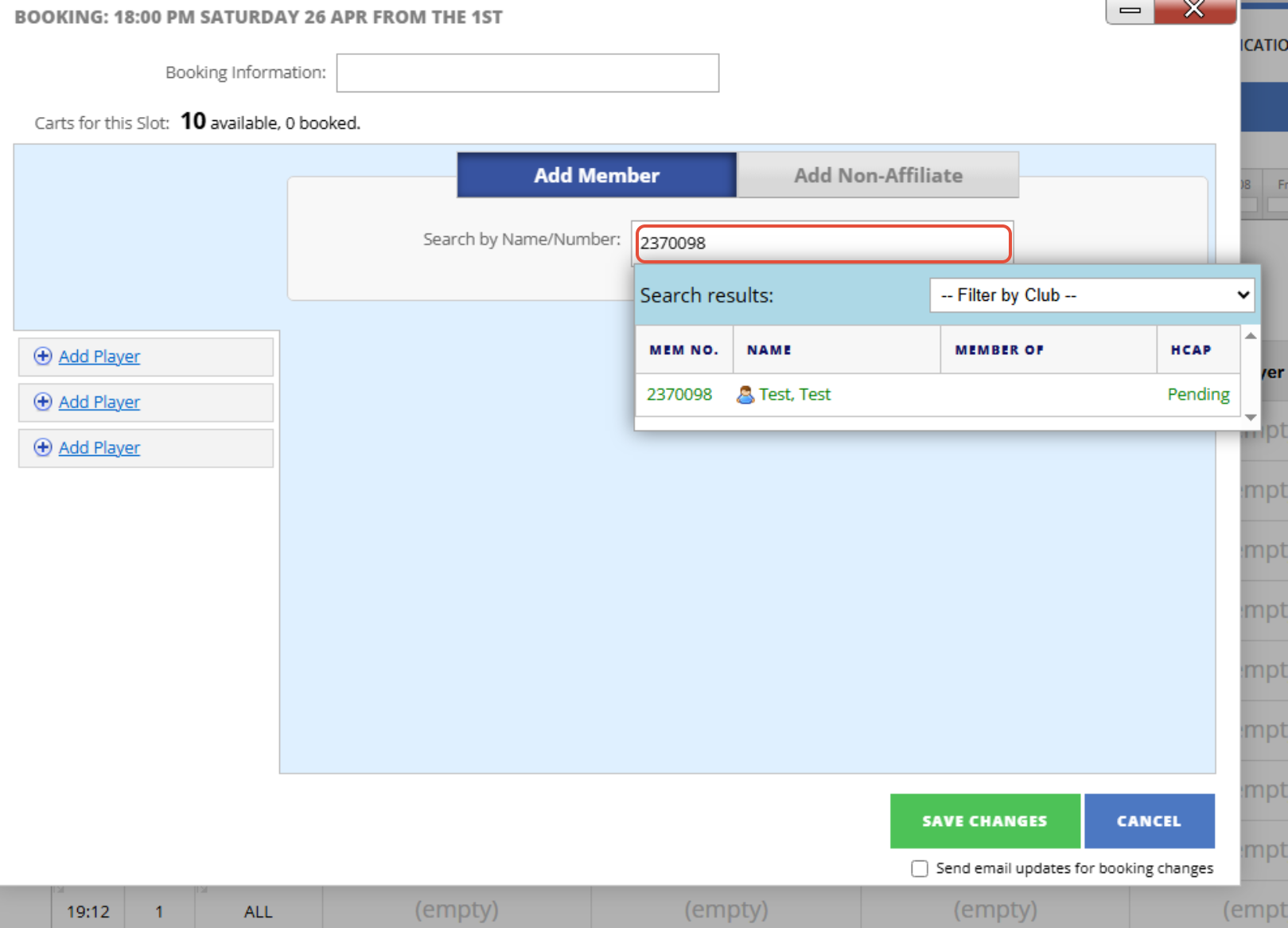 7. Then once you are finished Creating the Tee Booking press Save Changes to add the player/s to the Tee Time.