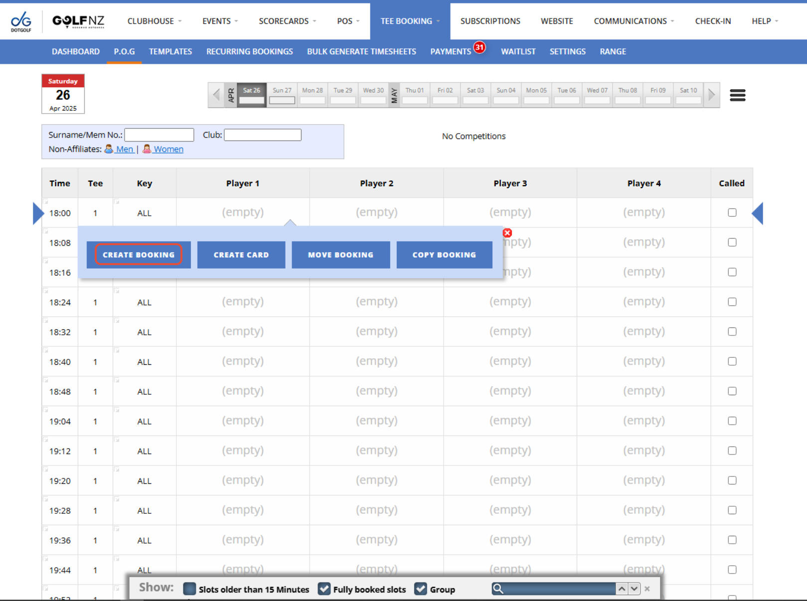 1. From the P.O.G tab, select the day you want to add the player to, then find and select their desired Tee Time. Now press "Create Booking". Please note if the day you are booking the player in for is not your current date, when you select the time you will be taken straight to the Create Booking Page.