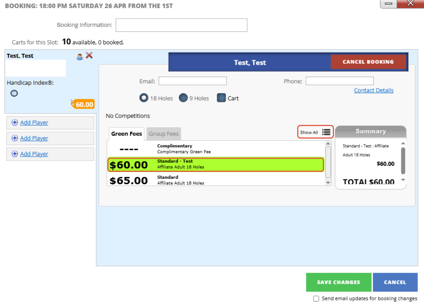 5. For both members and non-affiliate, DotGolf will automatically assign the player the cheapest applicable Green Fee. If you need to change this you can press "Show All" and choose the necessary Green Fee.