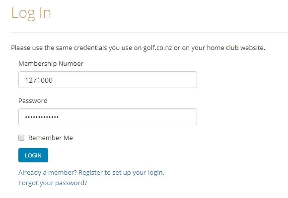 - Enter your membership number and password (same as the one you use to log into golf.co.nz or your club website):