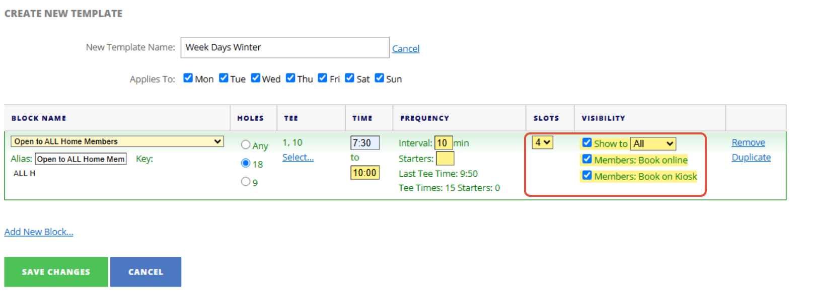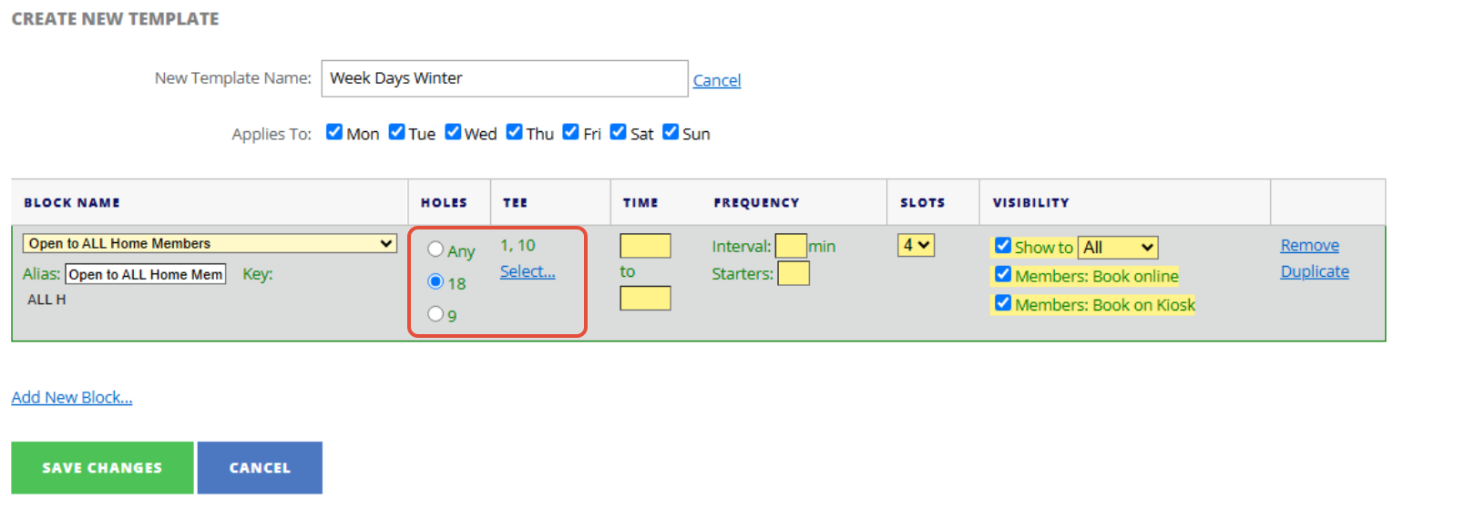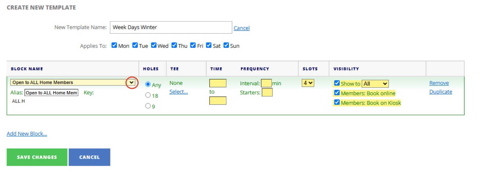 3. Using the Block Name drop down and select who is eligible to play in this block. For example: ALL Home Members.