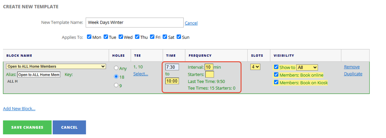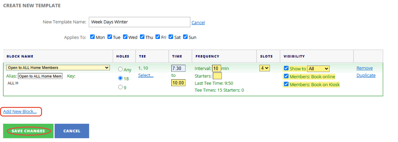 2. Enter the name of your Tee Booking template, for example: Week Days Winter and select what days it template applies to.