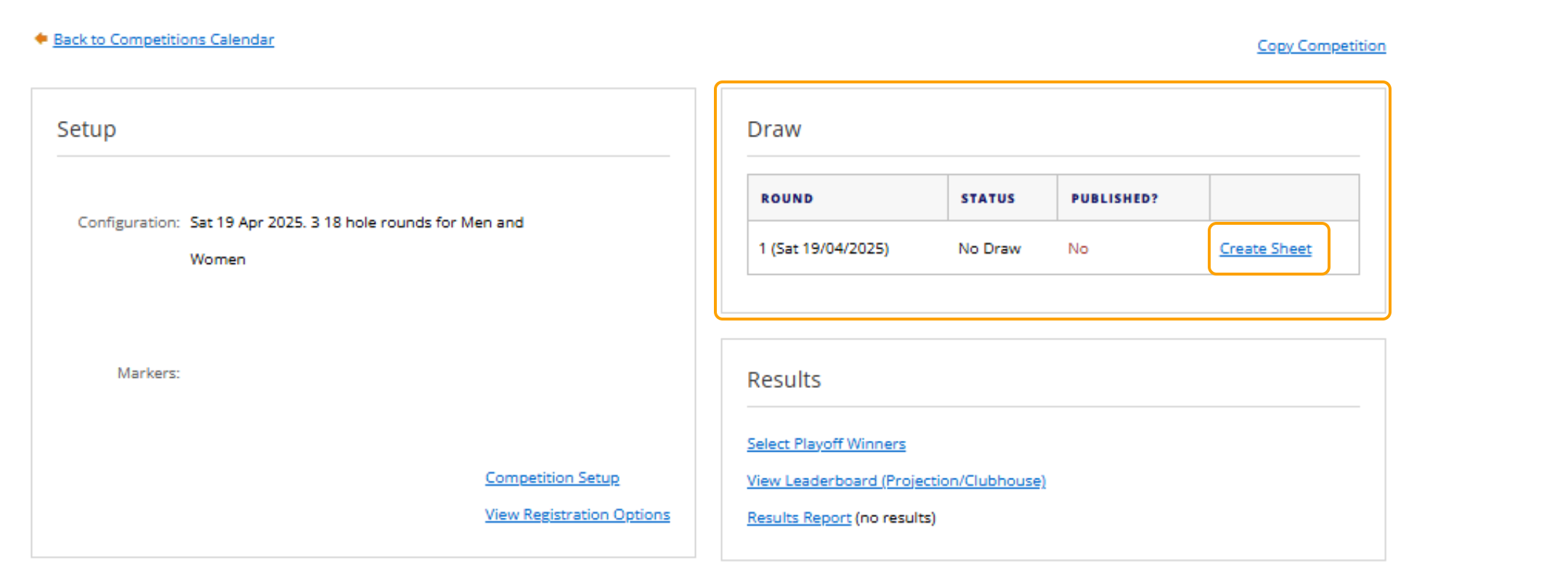 Please note the Tee Sheet must be created and have correct eligibility available e.g men, home members and be compatible with the competitions start and end time.