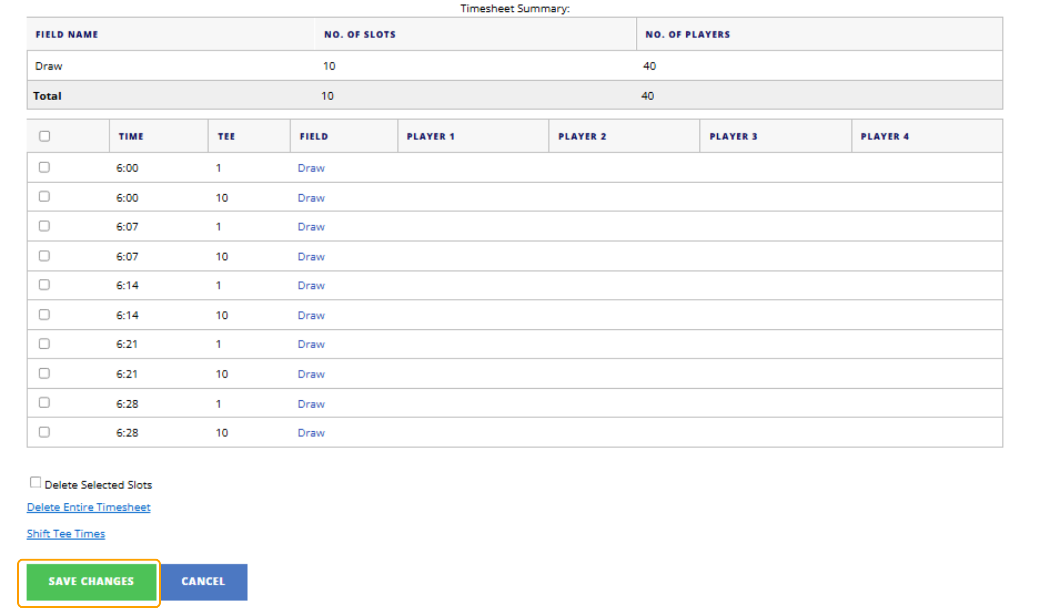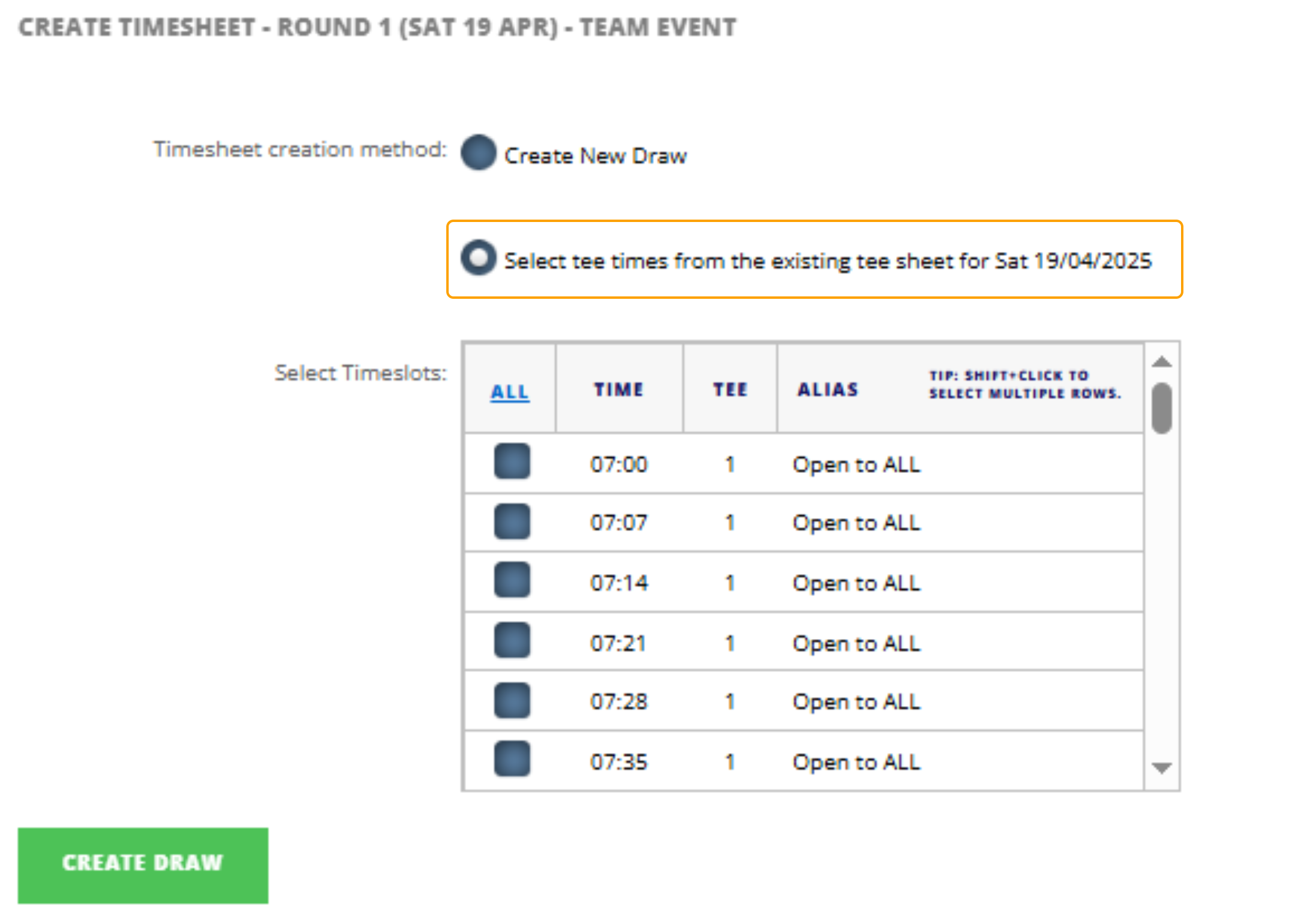 3. Choose the Tee Times that you would like to use for the Draw Sheet