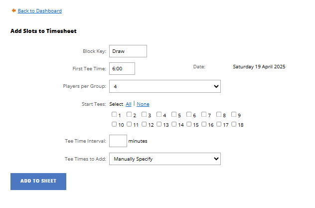 - Tee Times To Add: Choose form Manually Spcifify, This will allow you to put the number of payers or the number of tee times.