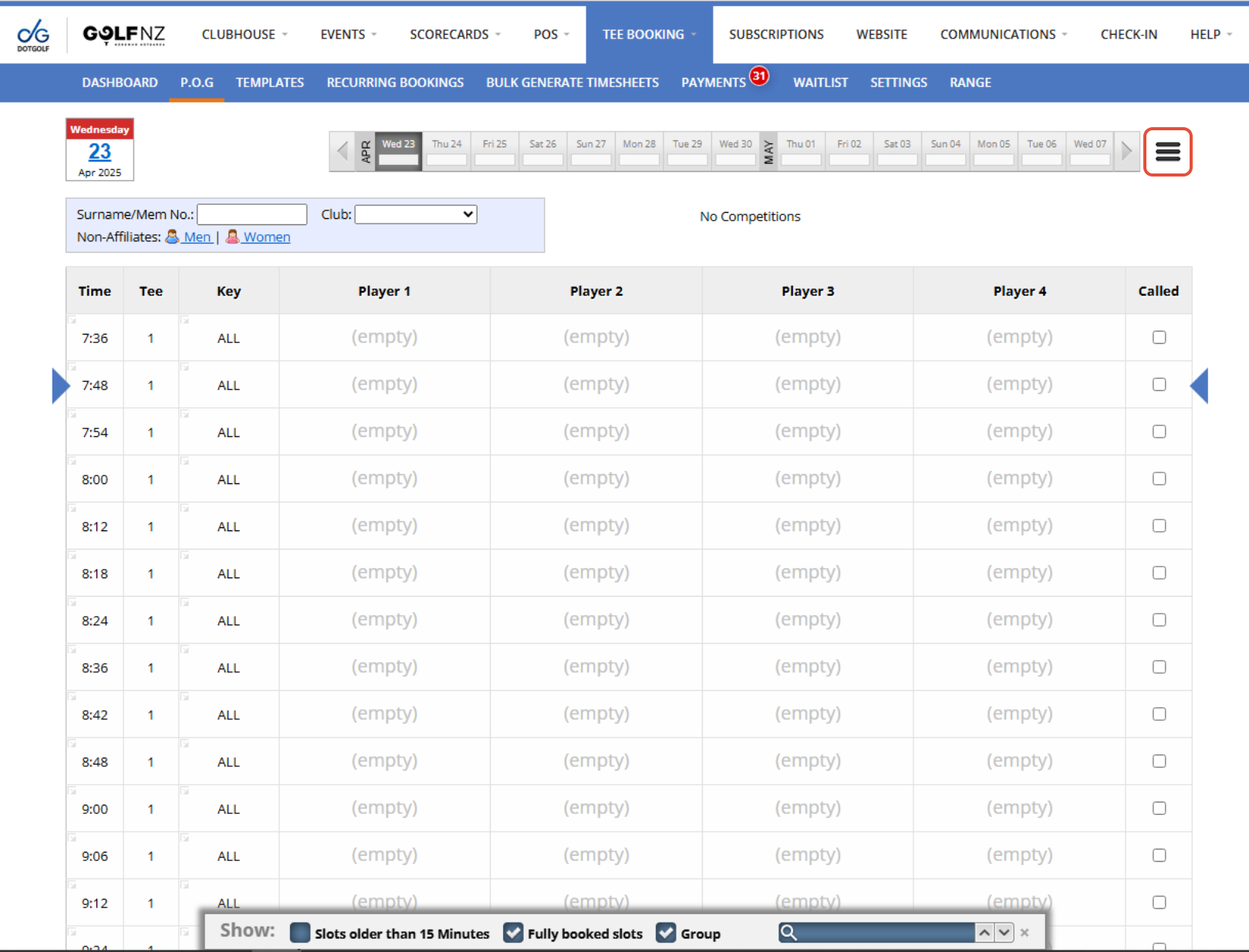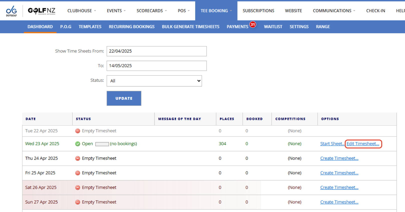 A Timesheet can be edited two different ways. One way is through the Tee Booking Dashboard, the other is through the P.O.G tab.