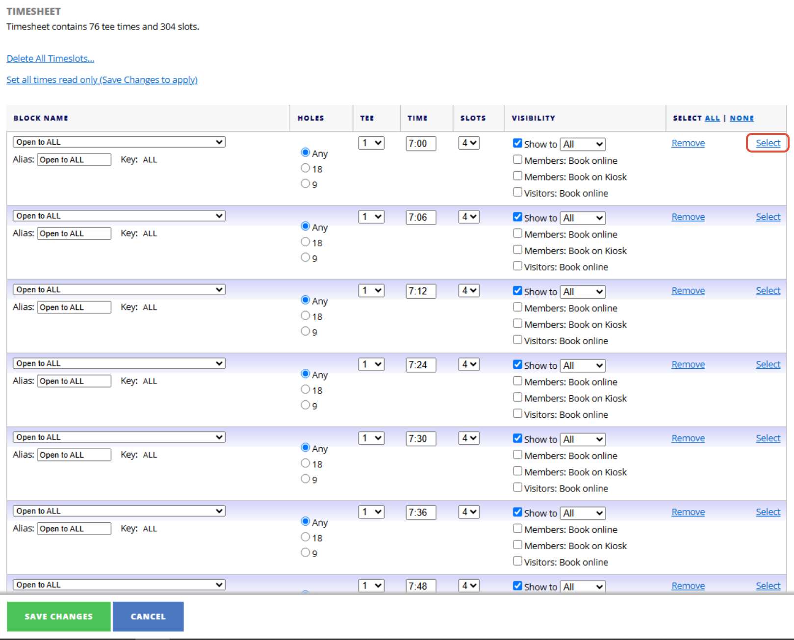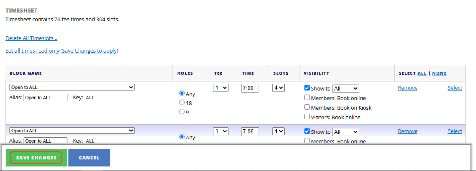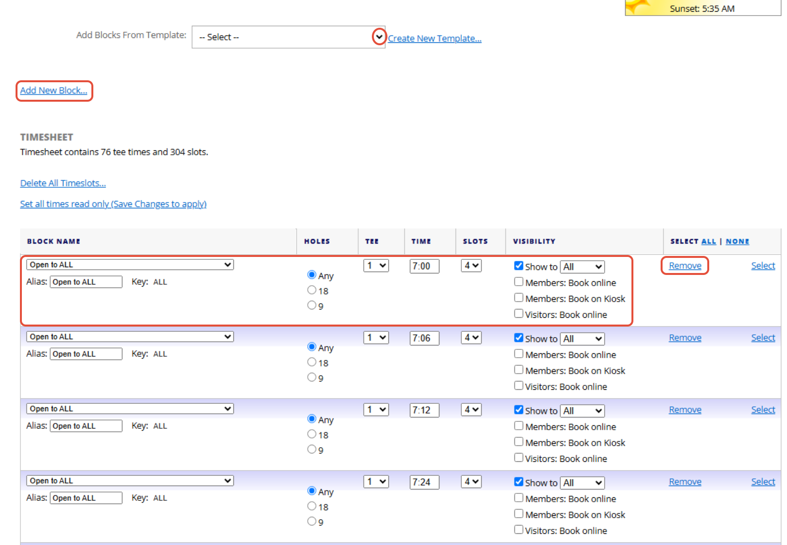 2. You can then edit any of the blocks within the timesheet or remove blocks/add new blocks. You can also add blocks from a template by selecting the template from the dropdown. Please note you can only remove blocks if there is no Tee Bookings in that block.