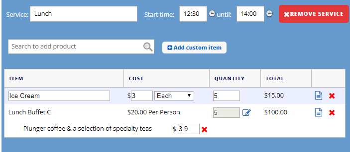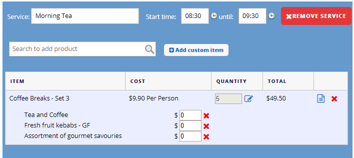 1. Fill in the service name (e.g. Morning tea) and the service start and time.