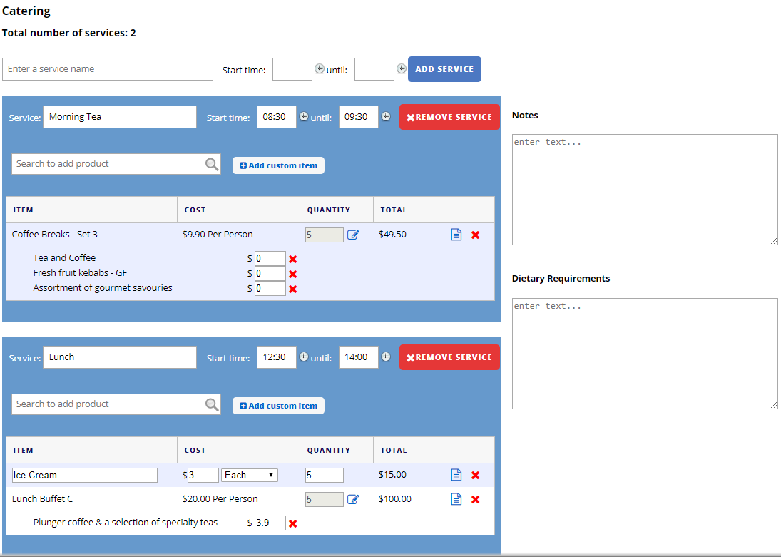 You can add catering services upon booking or to an existing booking.