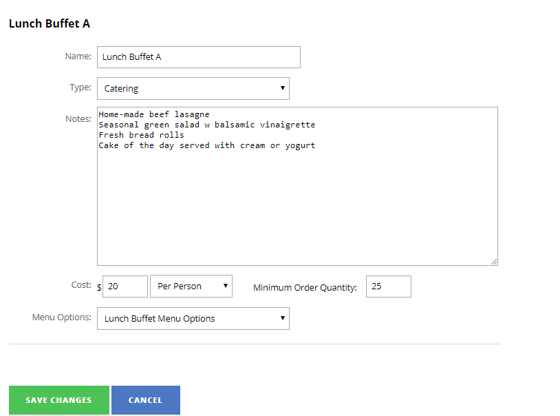 - Notes - description of the product. More appropriate for catering products that is composed of multiple items like buffets and set menus.
