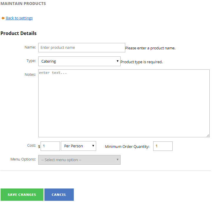 - Menu Options - menu options linked to this product (Catering product only)