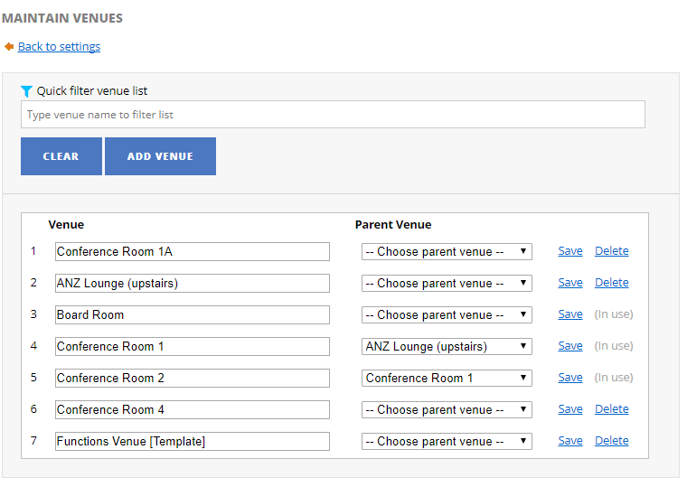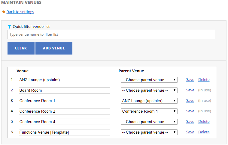 Note: The system only allows you to delete a functions venue if its not booked (current day or upcoming functions).