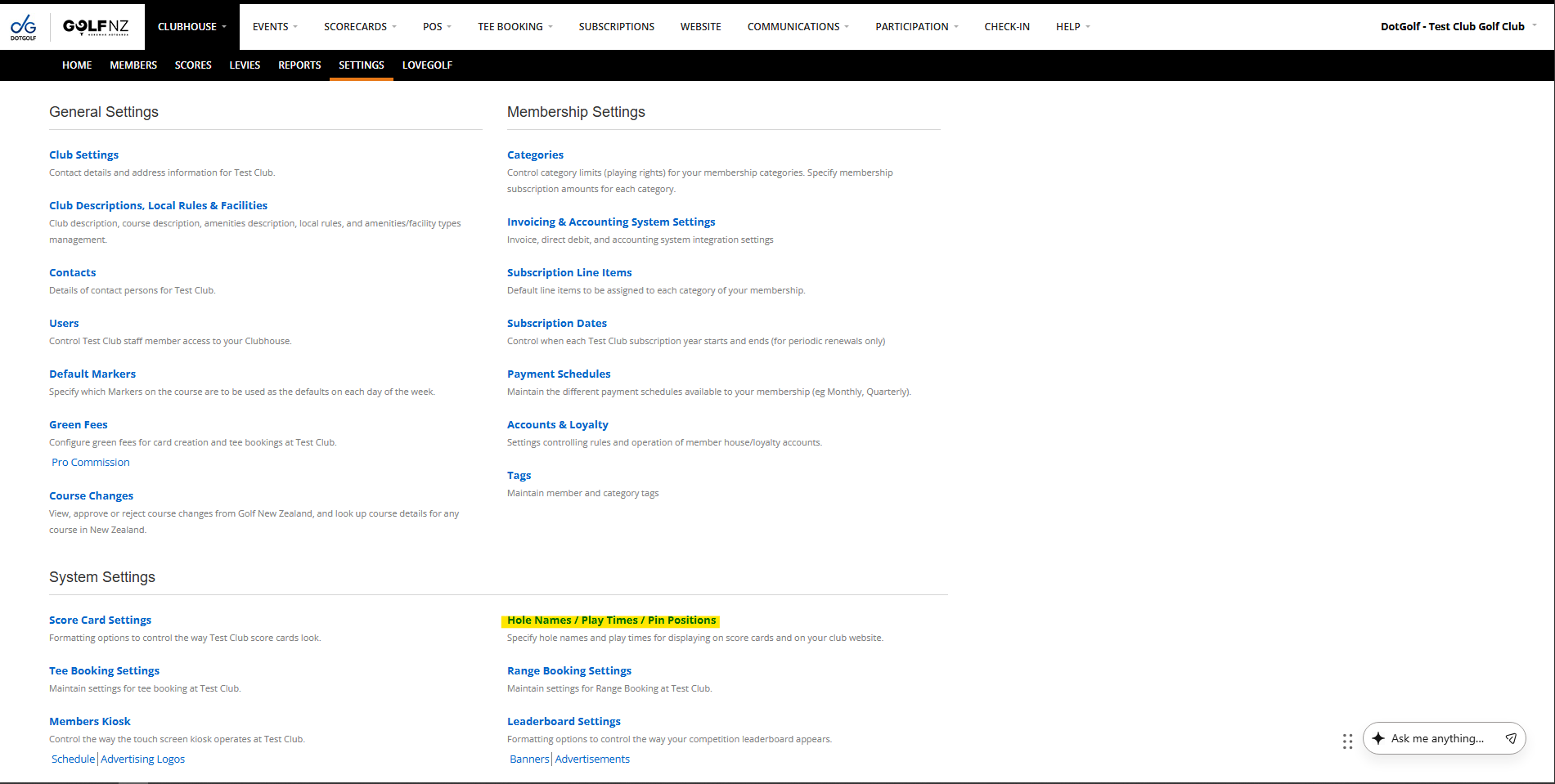 The Hole Names / Play Times / Pin Positions Settings can be found under Clubhouse > Settings in the System Settings section:
