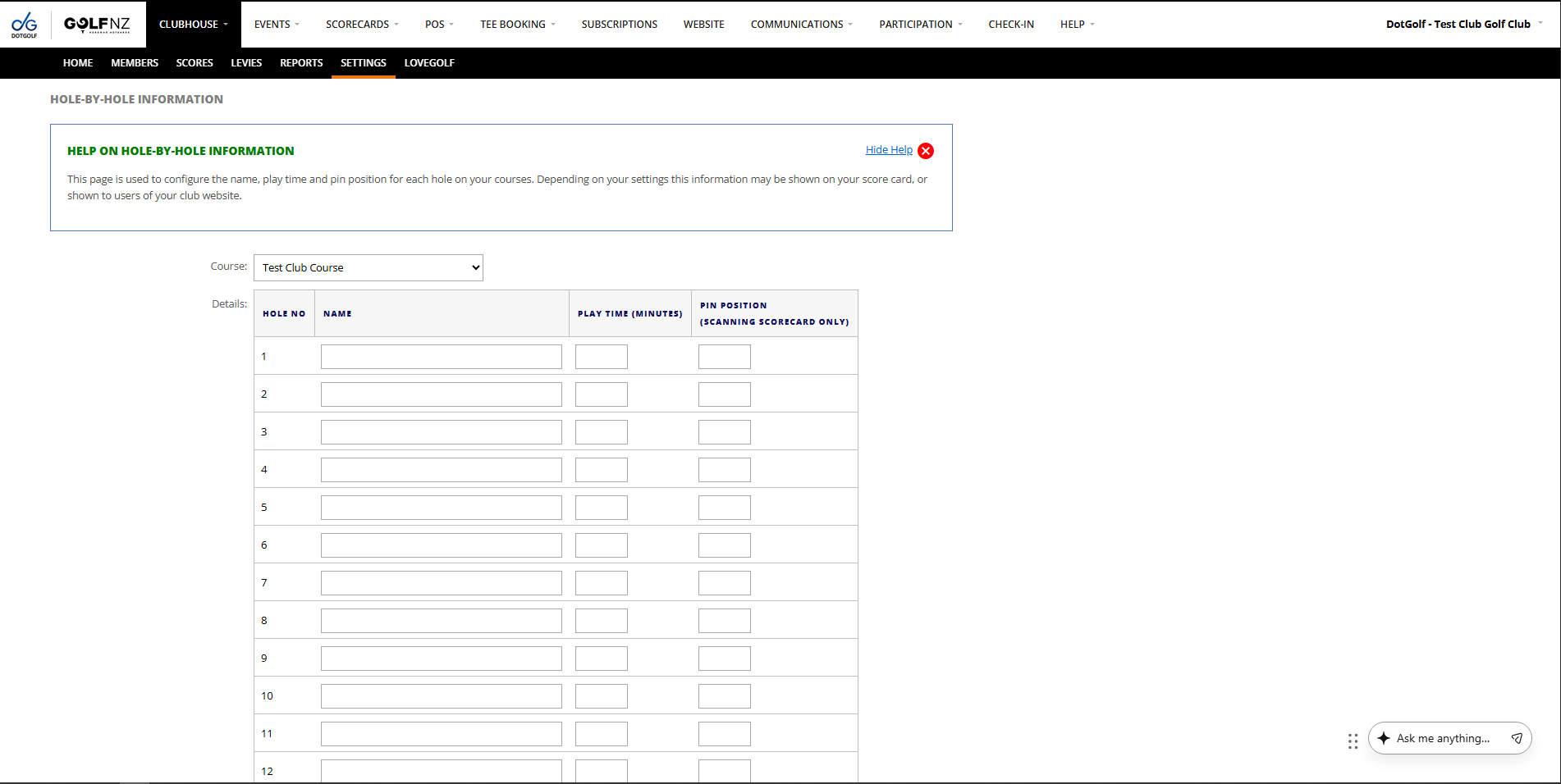 This page is used to configure the name, play time and pin position for each hole on your courses. Depending on your settings this information may be shown on your score card, or shown to users of your club website.