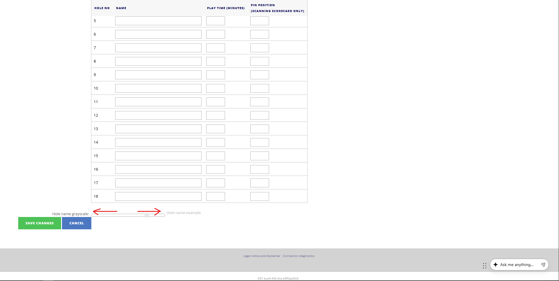 At the bottom of the screen there is the grey scale, which you will need to adjust if you are setting hole names. The hole names display on each hole row behind the boxes: