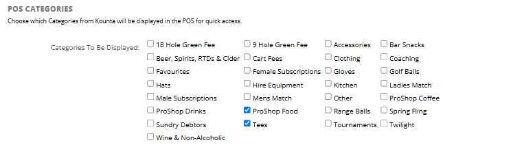 In the Kounta settings, the POS Categories that display on the DotGolf Point of Sale can be updated.