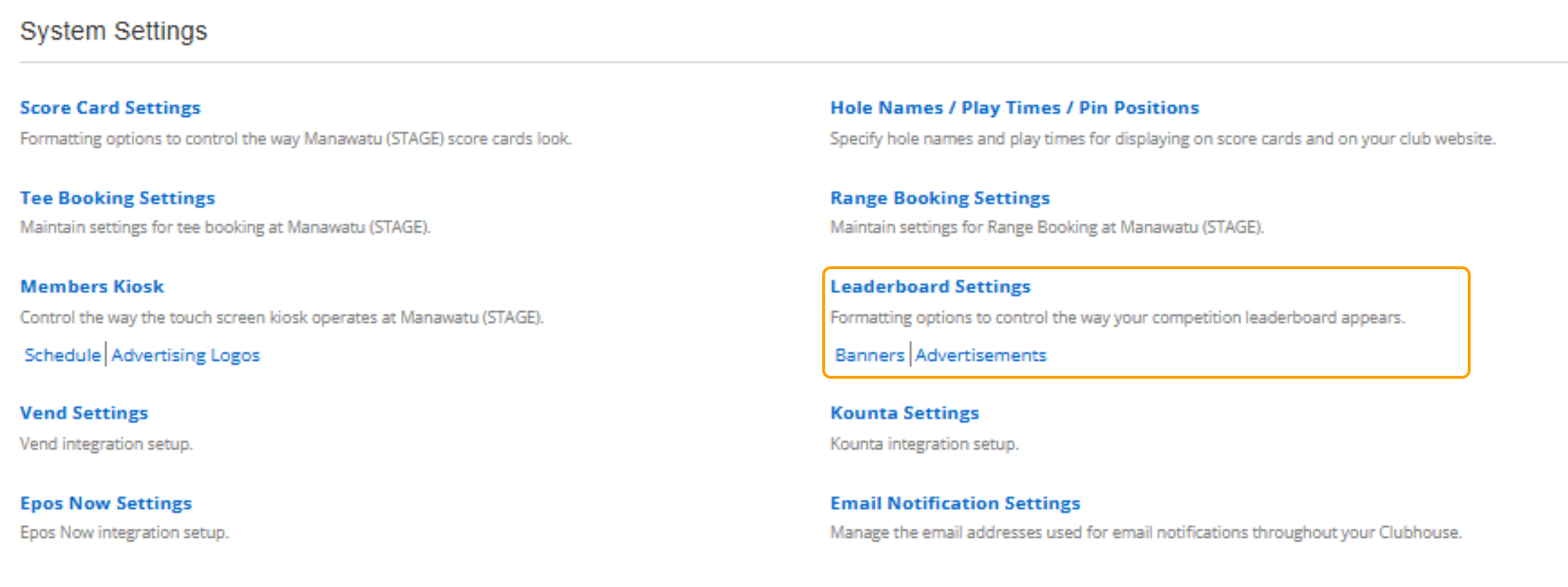 The leaderboard settings allow the club to customise the Competition Leaderboards.