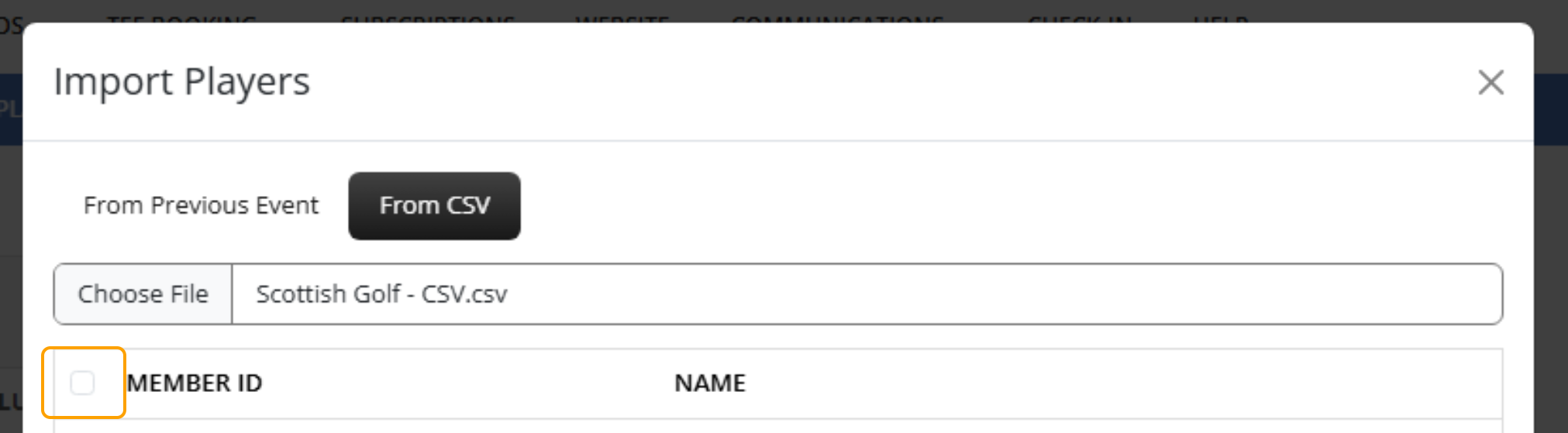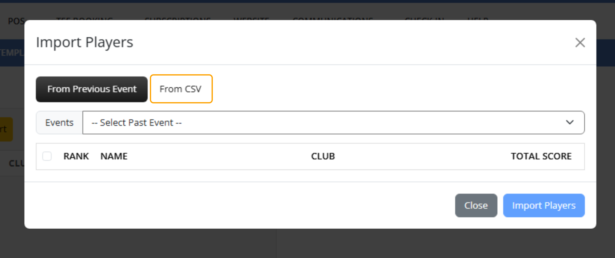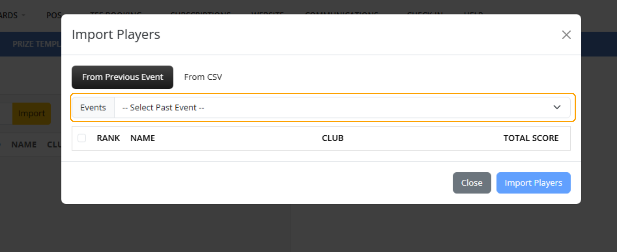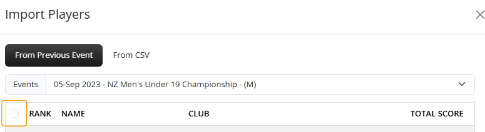 4. Using the dropdown, select the Event that you would like to import the players from
