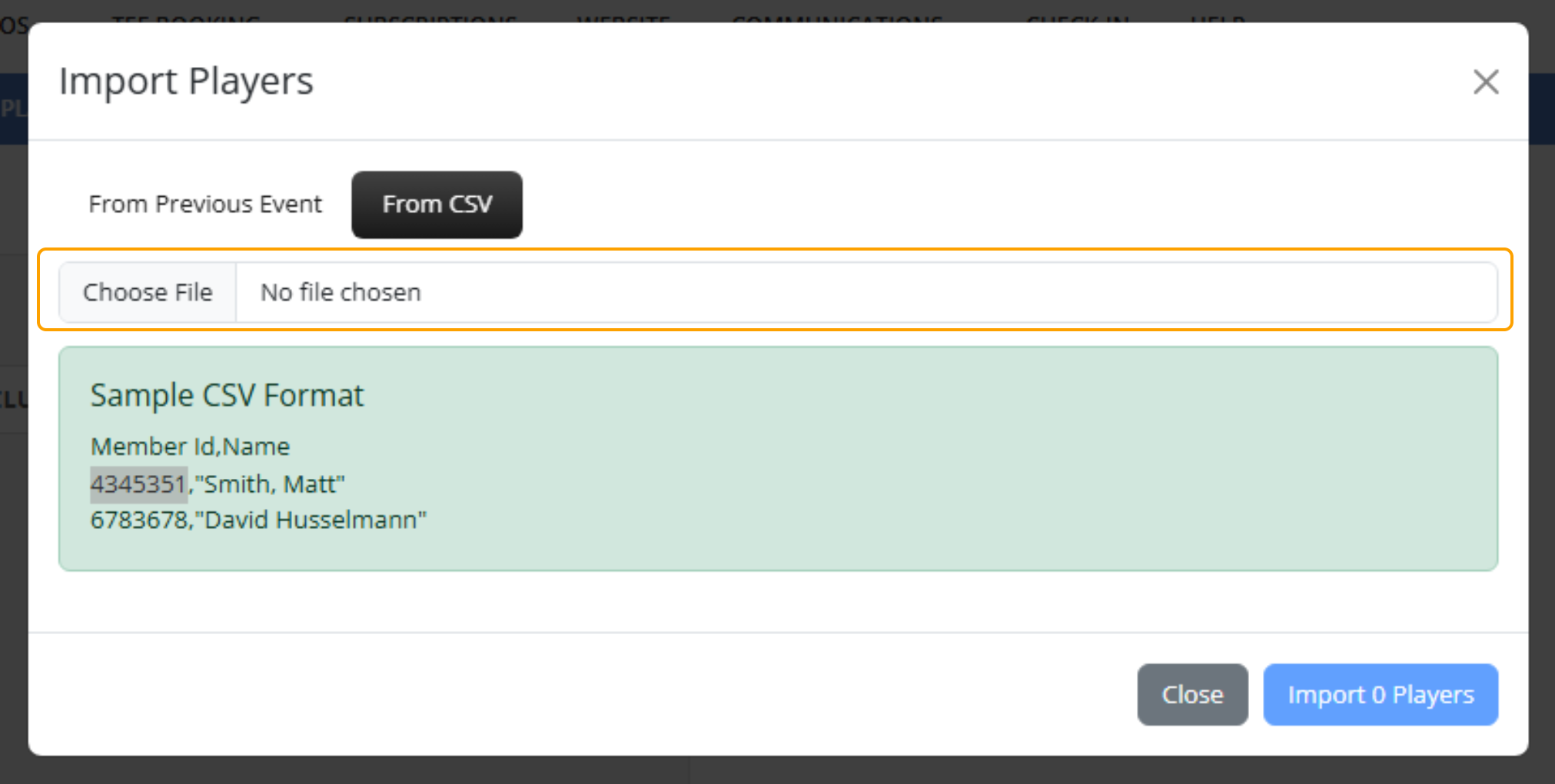 Players can be manually searched using the search bar. You can also import players from a Previous Event or a CSV File.
