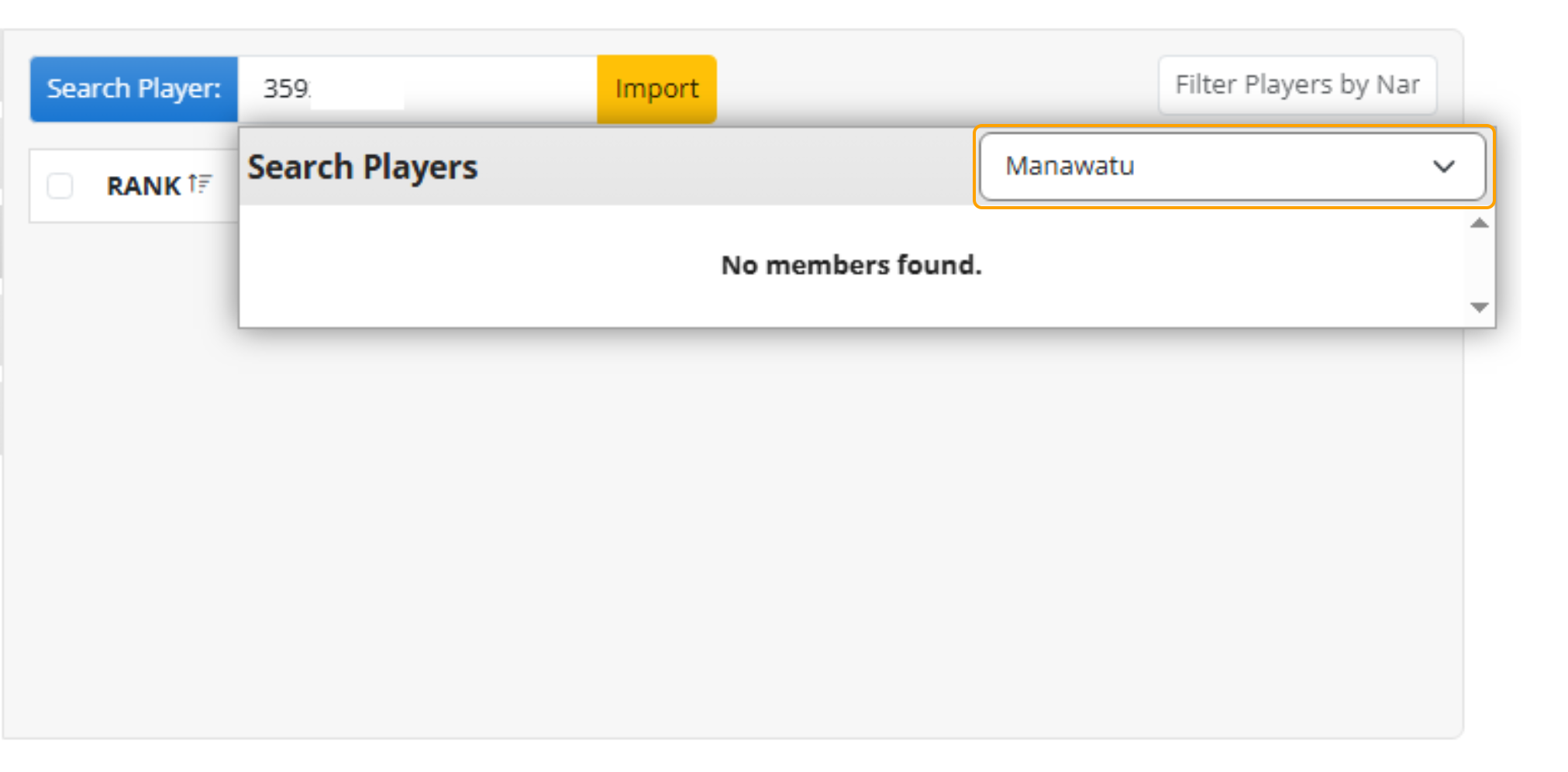 1. To Manually add players into the event, select the search bar and begin typing either the Membership Number or the Last Name of the player