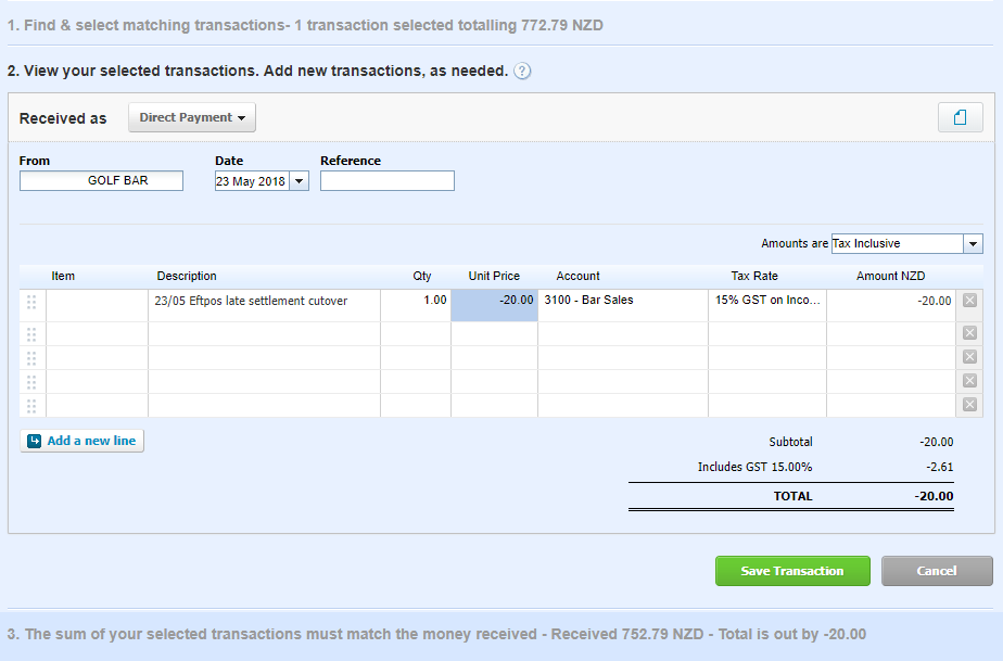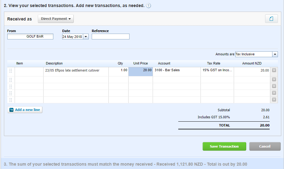 You can see there is a $20 discrepancy. This should match the amount of transactions that occurred after the automatic settlement cutover.