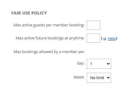 - Max bookings allowed by a member per day/week.