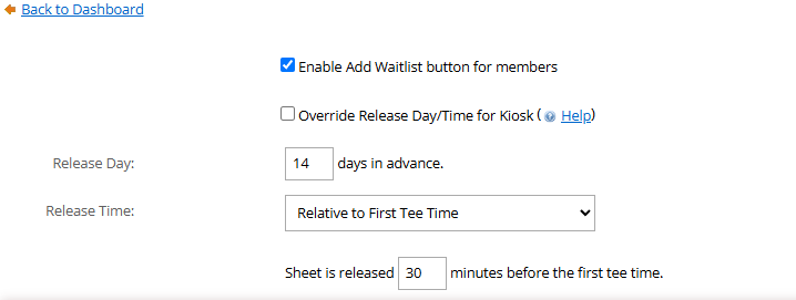 - If this is left unchecked, the kiosk will use the same release day and times as the online tee booking system.